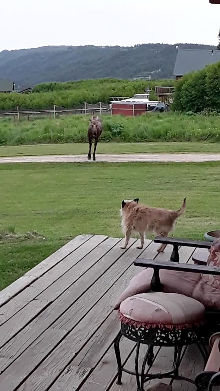 A dog barks at a moose in the yard and the moose runs at the dog, who then chases the moose back.