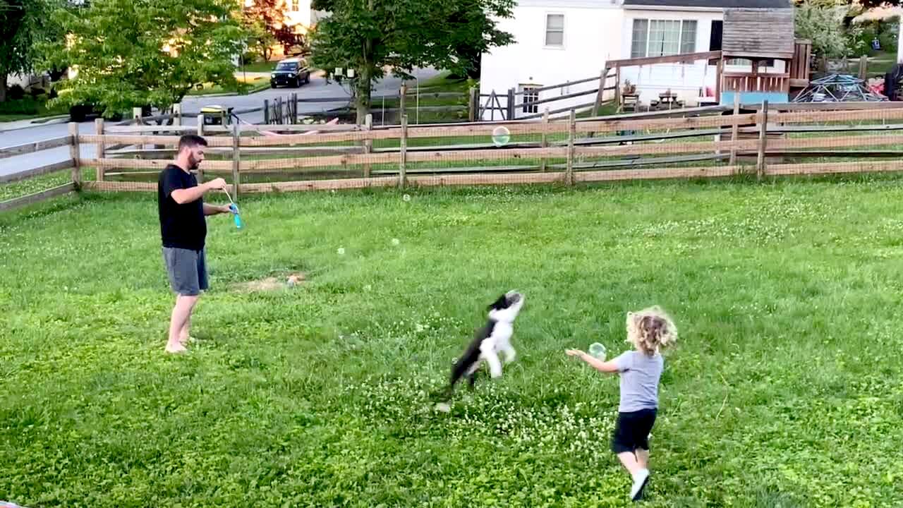 A Boston Terrier and a small boy chase bubbles being blown by a man. The dog jumps to catch a bubble and accidentally tackles the boy.