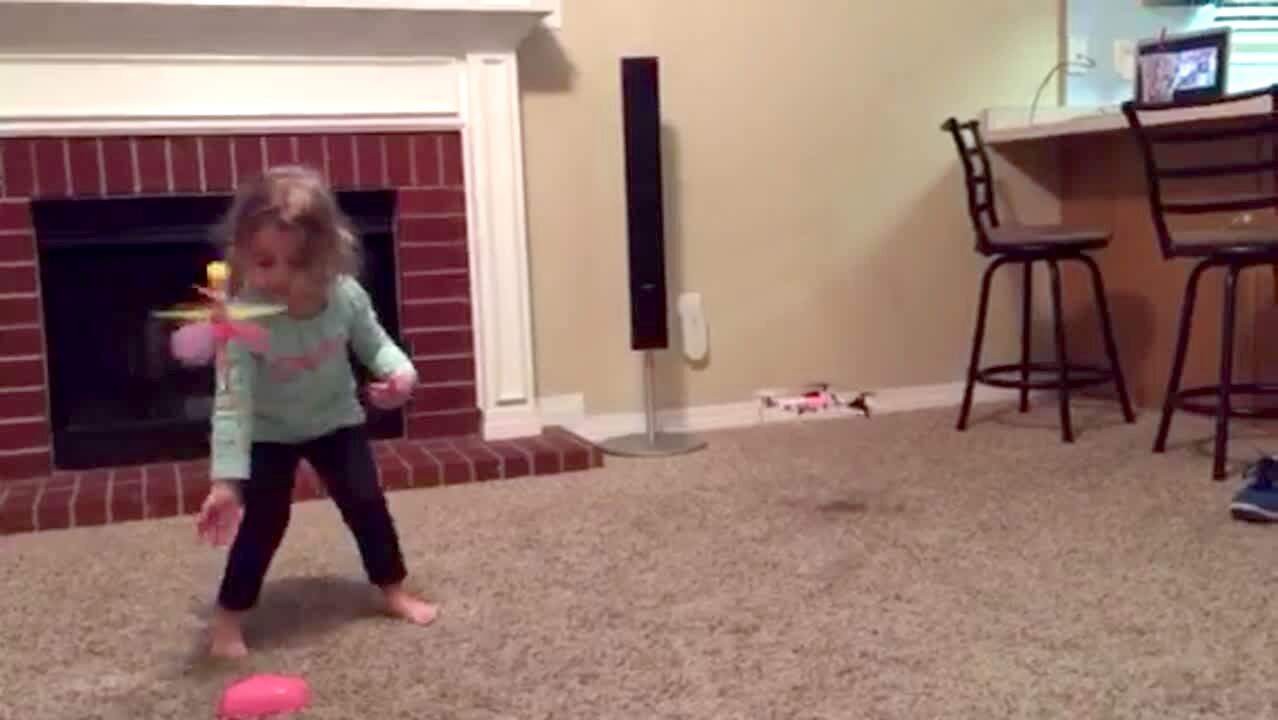 A tot girl plays with a flying fairy doll indoors when it flies at her face and gets caught in her hair.