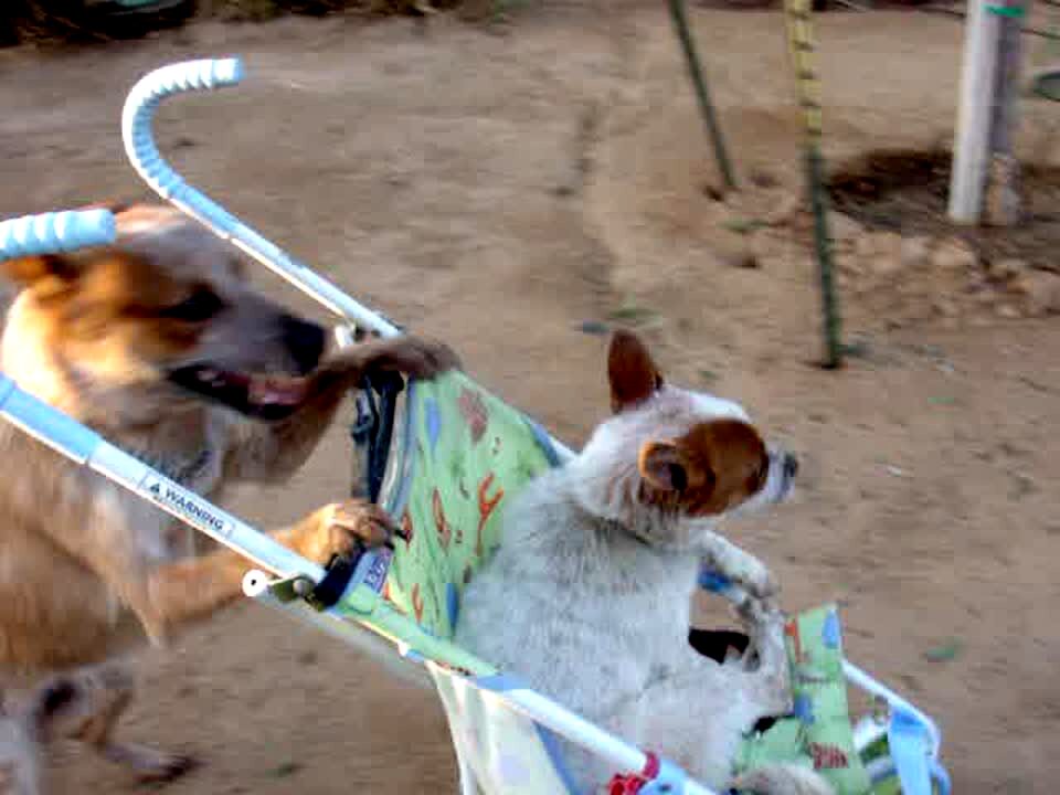 A dog pushes another dog around a yard in a stroller.