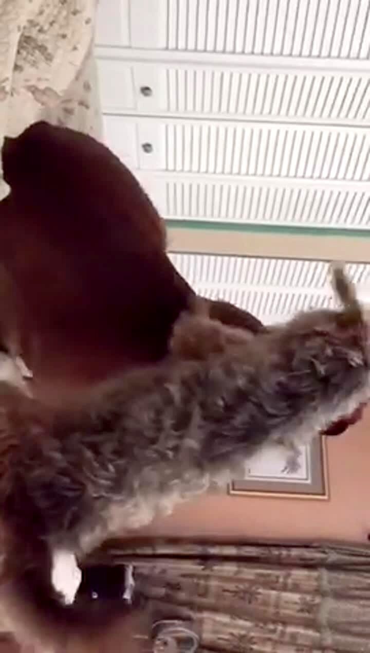 Teen boy pins dog's toy to a tree, the dog jumps up to try and get it. Dog pulls boy's shorts down.