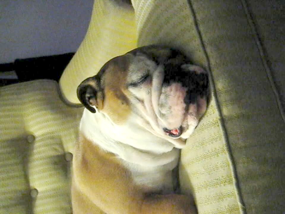 Bulldog is snoring and sleeping on the couch. Dog's jowls move while he snores.