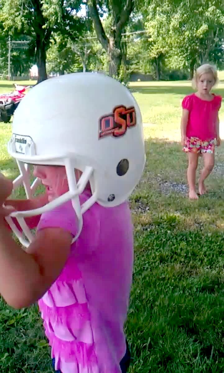 A little girl cries for her mom after getting her head and arms stuck in the face mask bars of a football helmet.