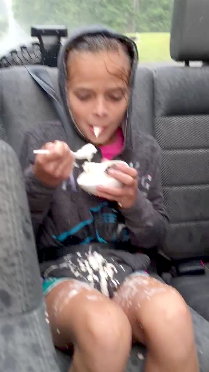 A girl sits in the backseat of a jeep car with no roof and struggles to eat ice cream while it rains and wind blows hard. She spills ice cream all over herself and gets wet from the rain.