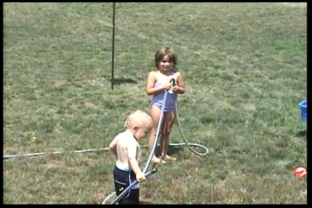 Tot boy holds the hose & doesn't know why the water stops. His sister holds the hose to trick him. Boy points hose at girl when she lets go & girl gets wet. Practical jokes backfires.