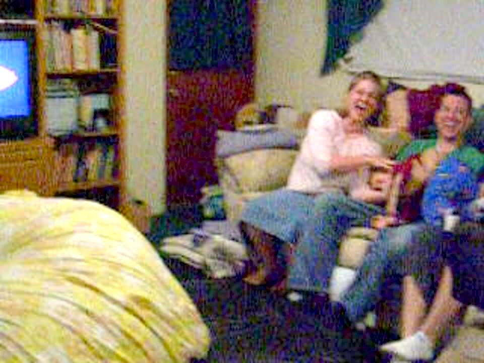 Tot boy counts down and is launched off an air mattress. Dad sitting in chair catches him. Short clip.