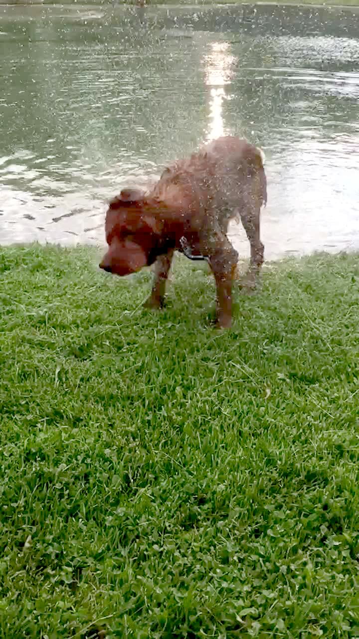 A Golden Retriever dog climbs out of a pond outdoors and shakes himself off in slow motion.