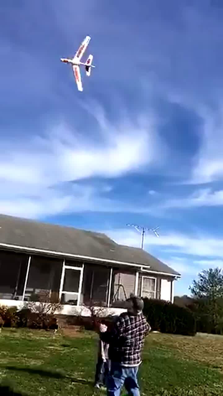 A man accidentally flies his remote controlled model plane towards his wife. She screams, jumps out of the way, and the plane crashes into the side of a house. She shouts "you idiot!" POV camera.