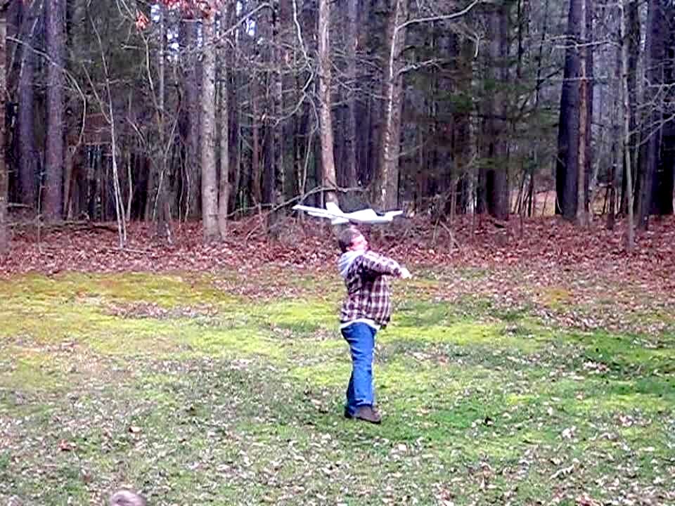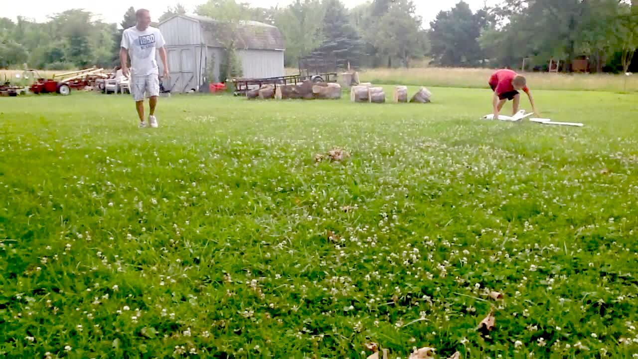 Man throws styrofoam model airplane in field, plane loops behind him and hits him in head.