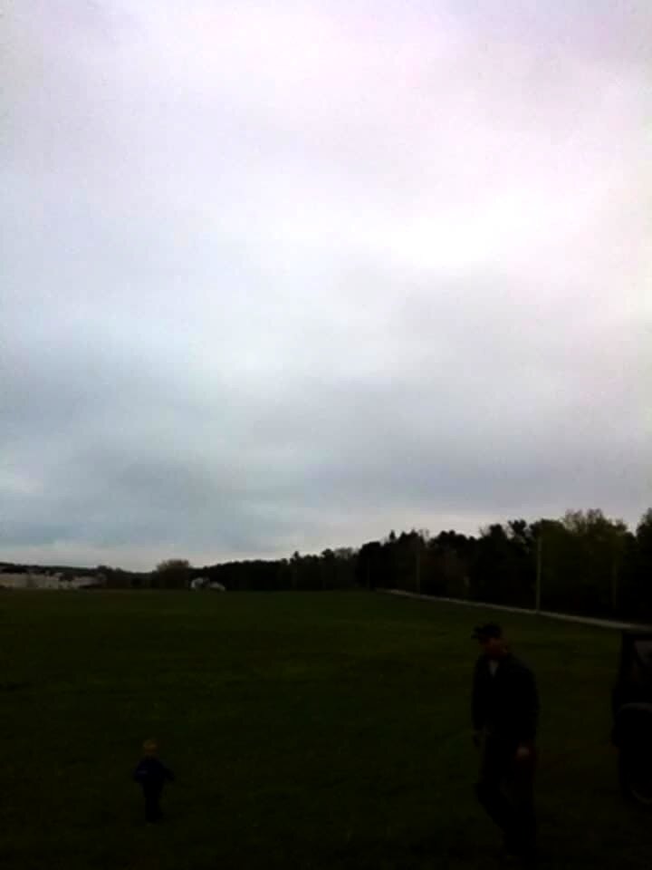 A man throws a foam model air plane up into the sky and it comes back down and hits his young son in the groin.