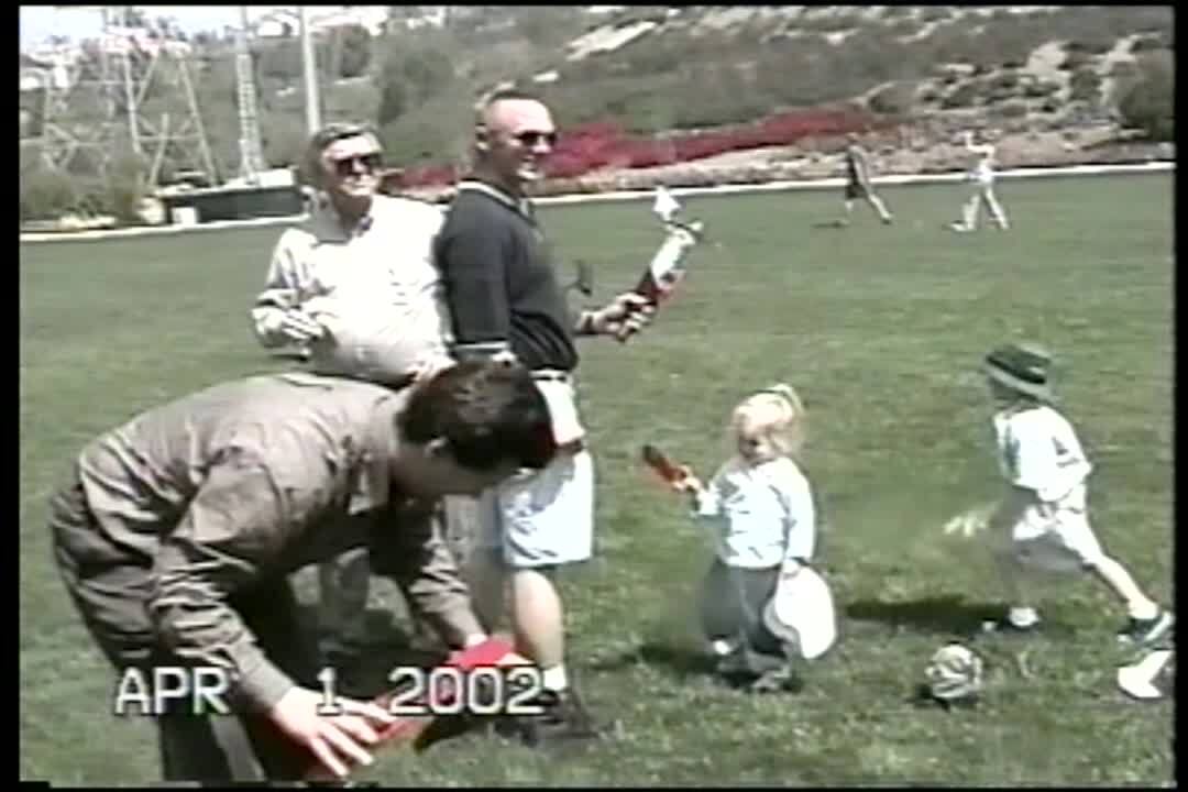 A man throws a large model airplane to his son but when the plane loops and flies back, a small girl runs to catch it and crashes into it before falling to the ground outdoors.