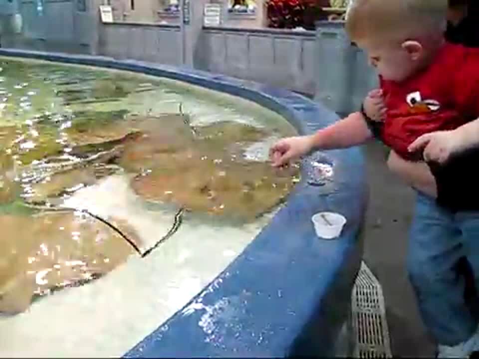 Tot boy watches stingrays at an indoor aquarium. 1 swims up to the side of the pool scares the boy his mom.