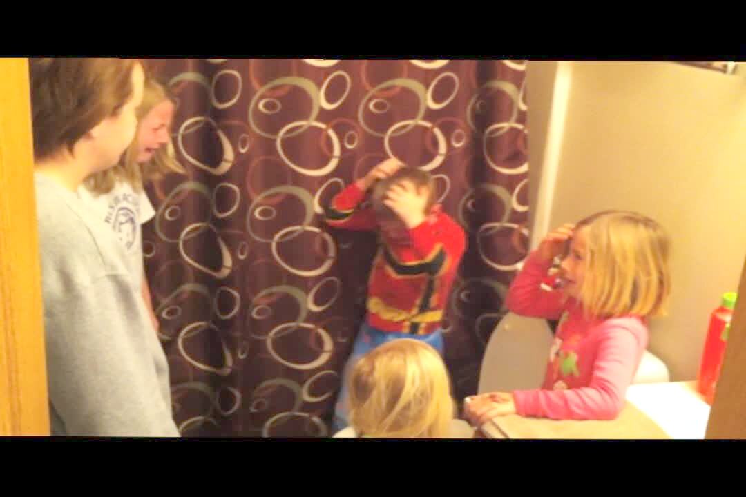 "Fish Funeral Fiasco" A group of kids are flushing a dead fish down the toilet. A boy flushes the toilet and one of the girls gets upset because she wanted to flush it. She hits him in the head with a plastic bowl and they both start crying. Sibling rivalry . Brother. Sister