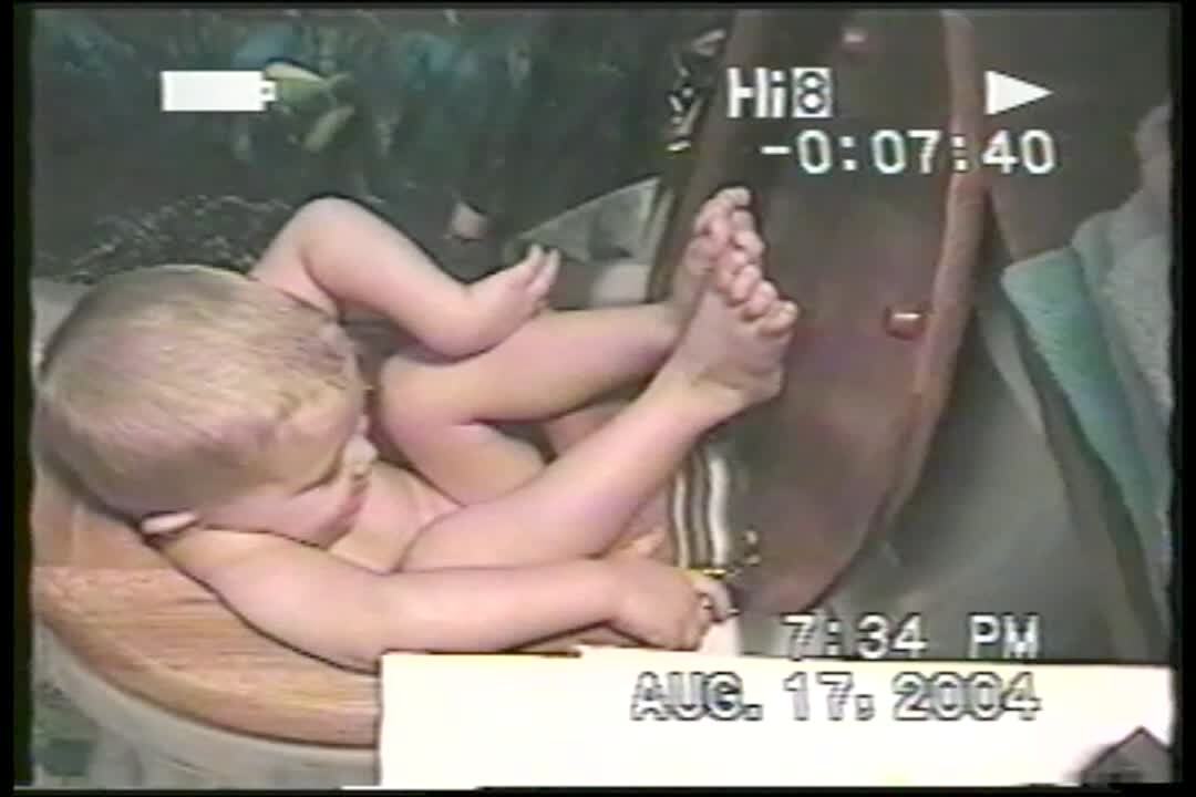 A tot boy stands inside a fish tank in his underwear in the living room while a woman laughs uncontrollably. Mom