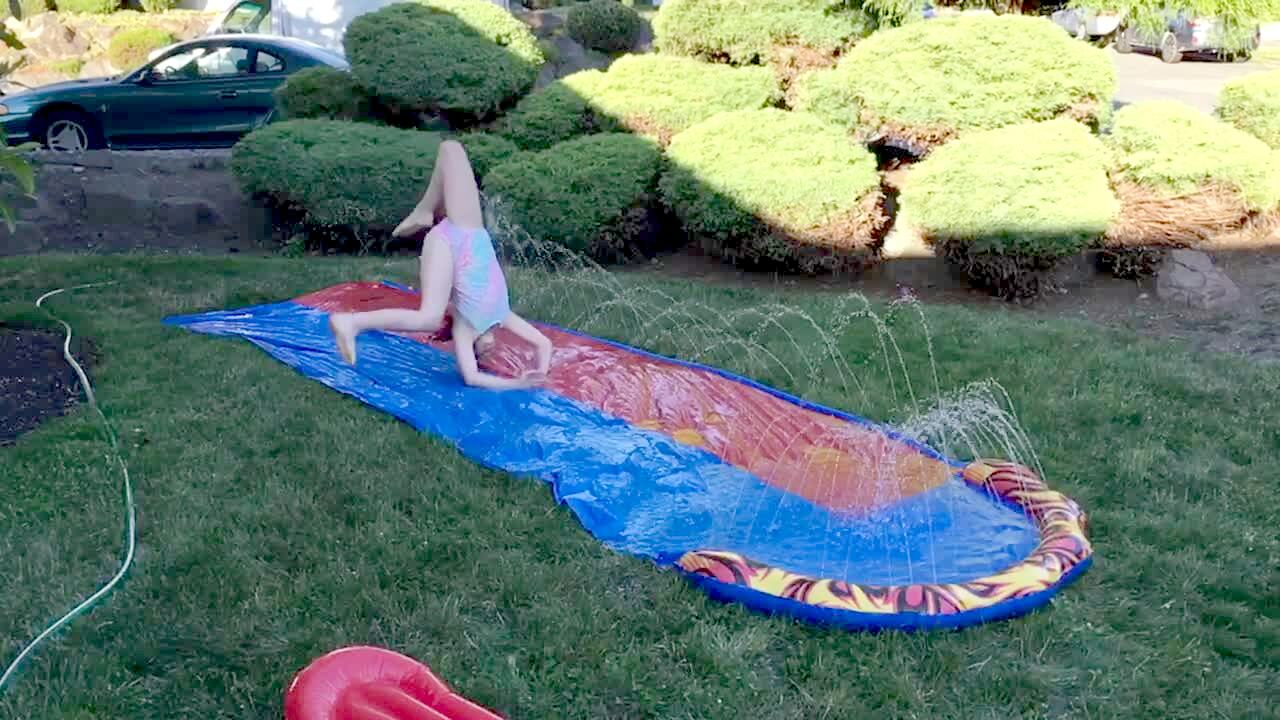 A young girl falls in a swimming pool when she misses pushing her tot brother in to the pool.