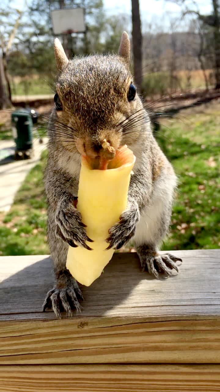 A squirrel grabs an apple core from a person and makes a funny noise as she eats it outdoors.