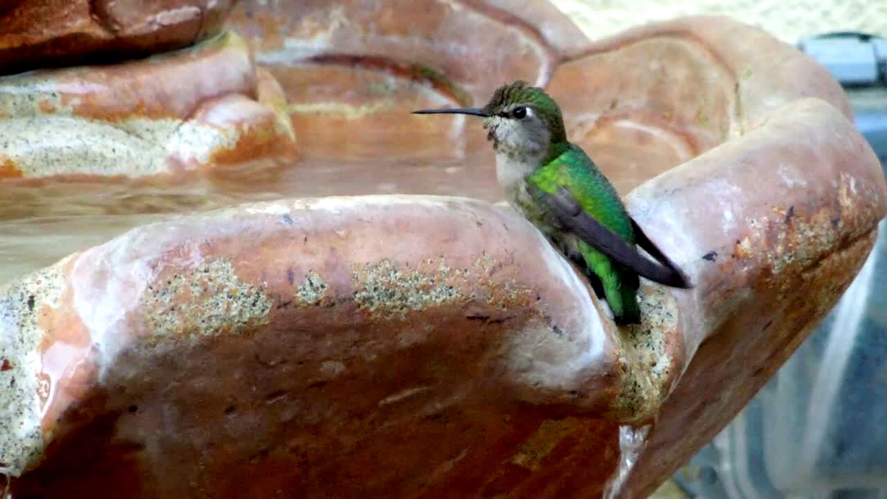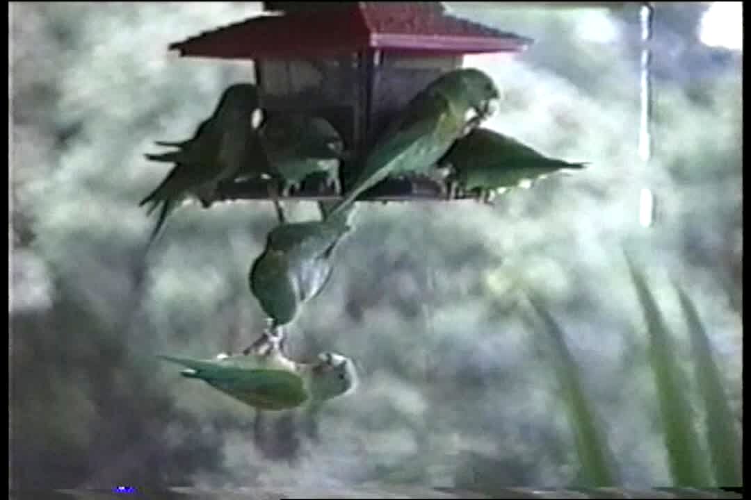 Birds hand off bird feeder, drop.