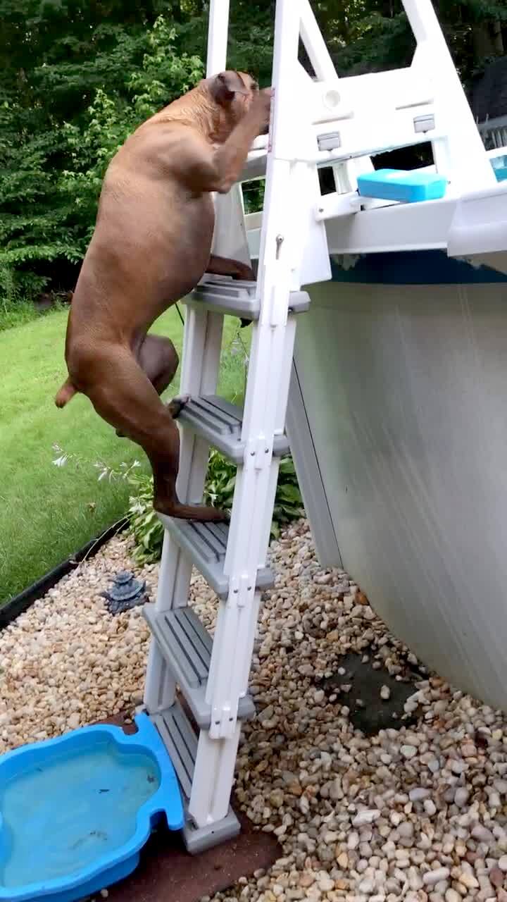 Teen boy tries to dive from trampoline into pool, the trampoline rips his leg gets stuck in it, he falls into the pool head first narrowly misses hitting his knee.