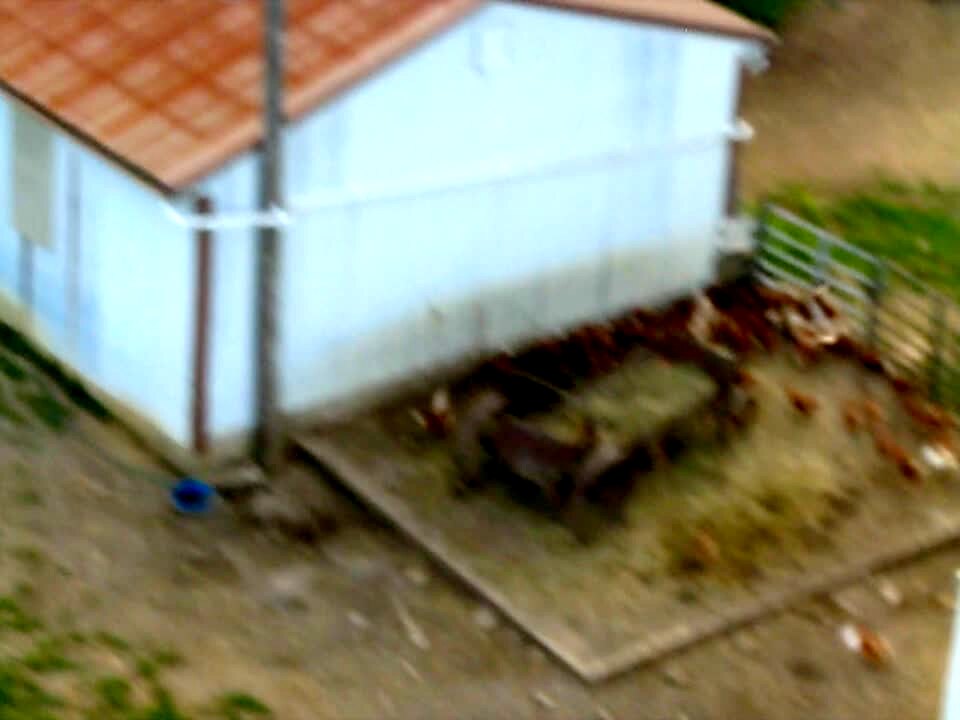 The people behind camera fly in a hot air balloon, scaring a near by barn of cows and chickens into a wall.
