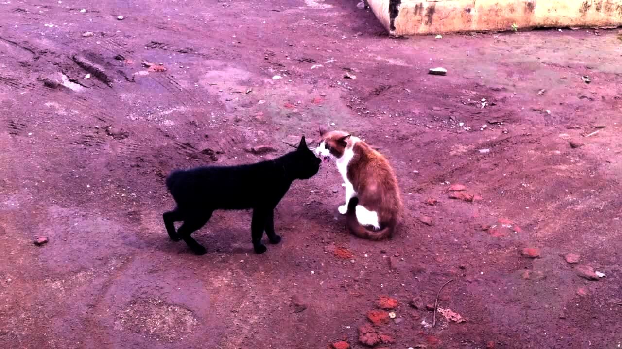 Two cats meow at each other outside and start fighting. The face off for thirty seconds and then suddenly start fighting at 0:34.