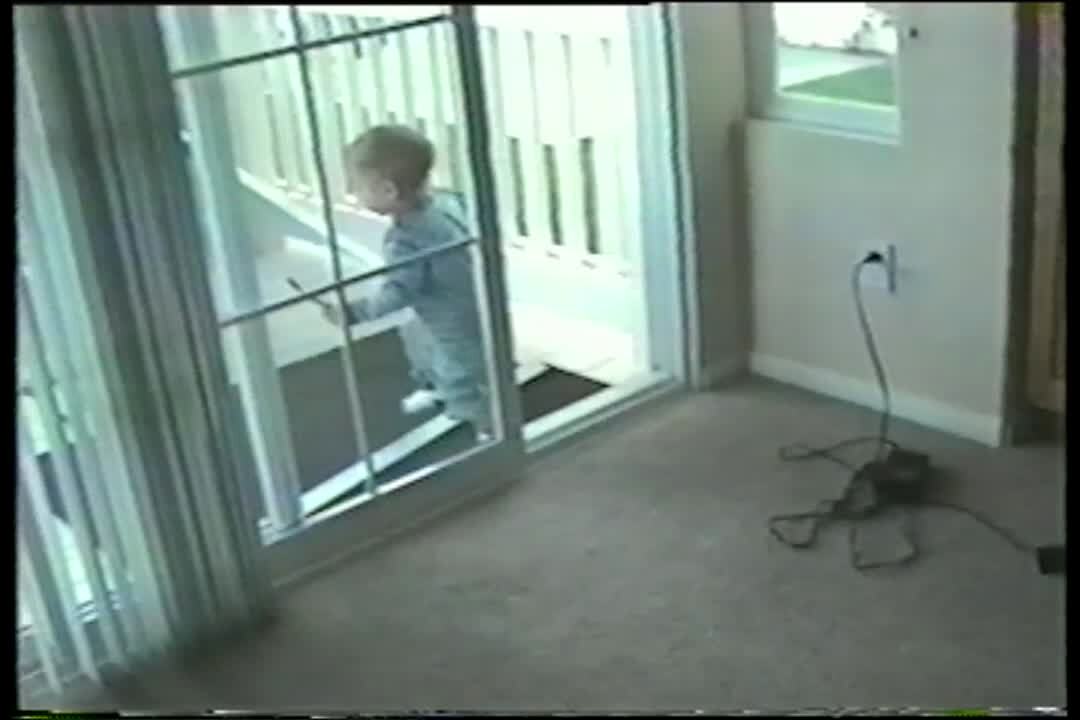 Little boy runs into door.