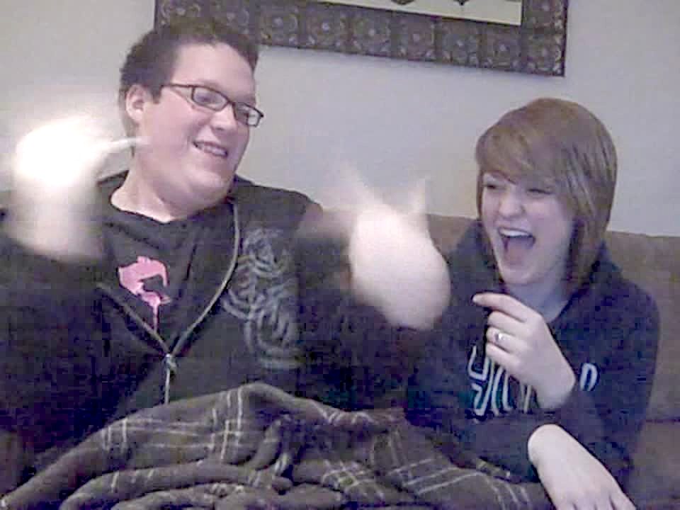 A boy and his sister talk to the camera and push playfully fight to push each other away from the camera. At 3:30 the girl raises a tube of wrapping paper to hit her brother but hits a light bulb on the ceiling and breaks it. The lights go out as the boy and girl try to figure out what to do.
