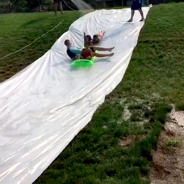 Two young boys and two young girls go down a slip n slide together, then a man crashes into them on the bottom and rolls over two of the small children.