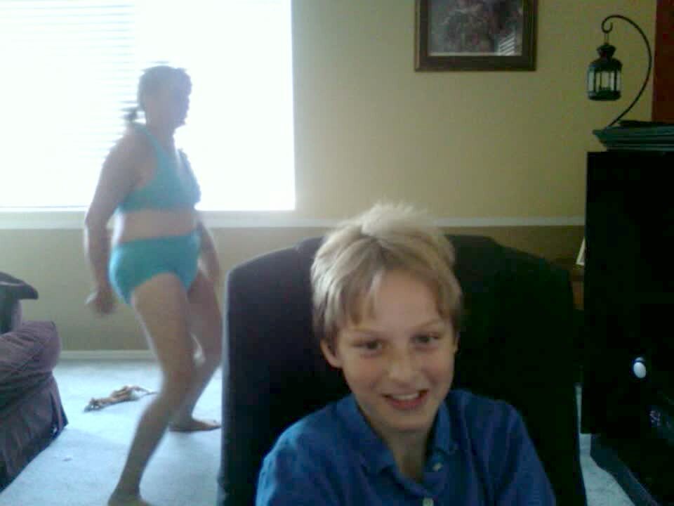 "Webcam Dance Jam" A woman dances to a work out video in her underwear as her son records her on a computer without her knowing indoors. Exercise. Mom.
