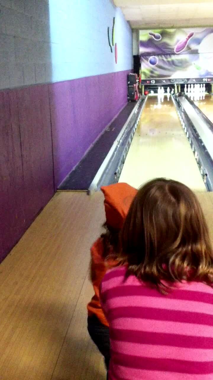 A boy runs to throw a bowling ball down a lane, then slips repeatedly on the floor.