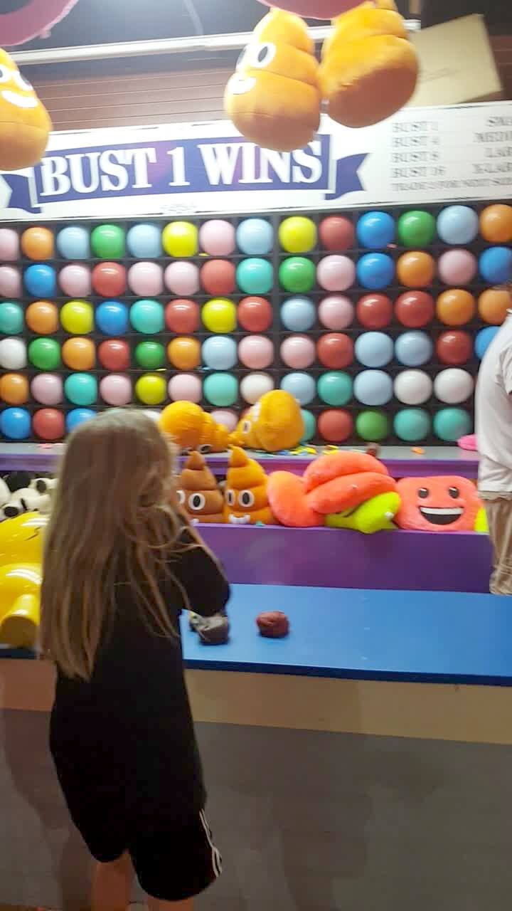 A young girl at a carnival hits the man operating the carnival game with a bean bag in the back of the head when she tries to hit a target.