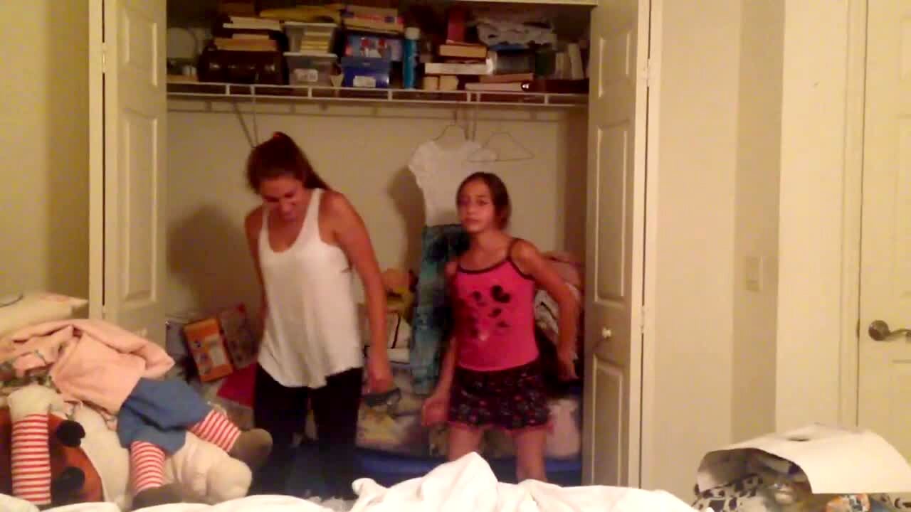 Two young girls do a dance routine where one of them smashes their head into the closet door indoors.