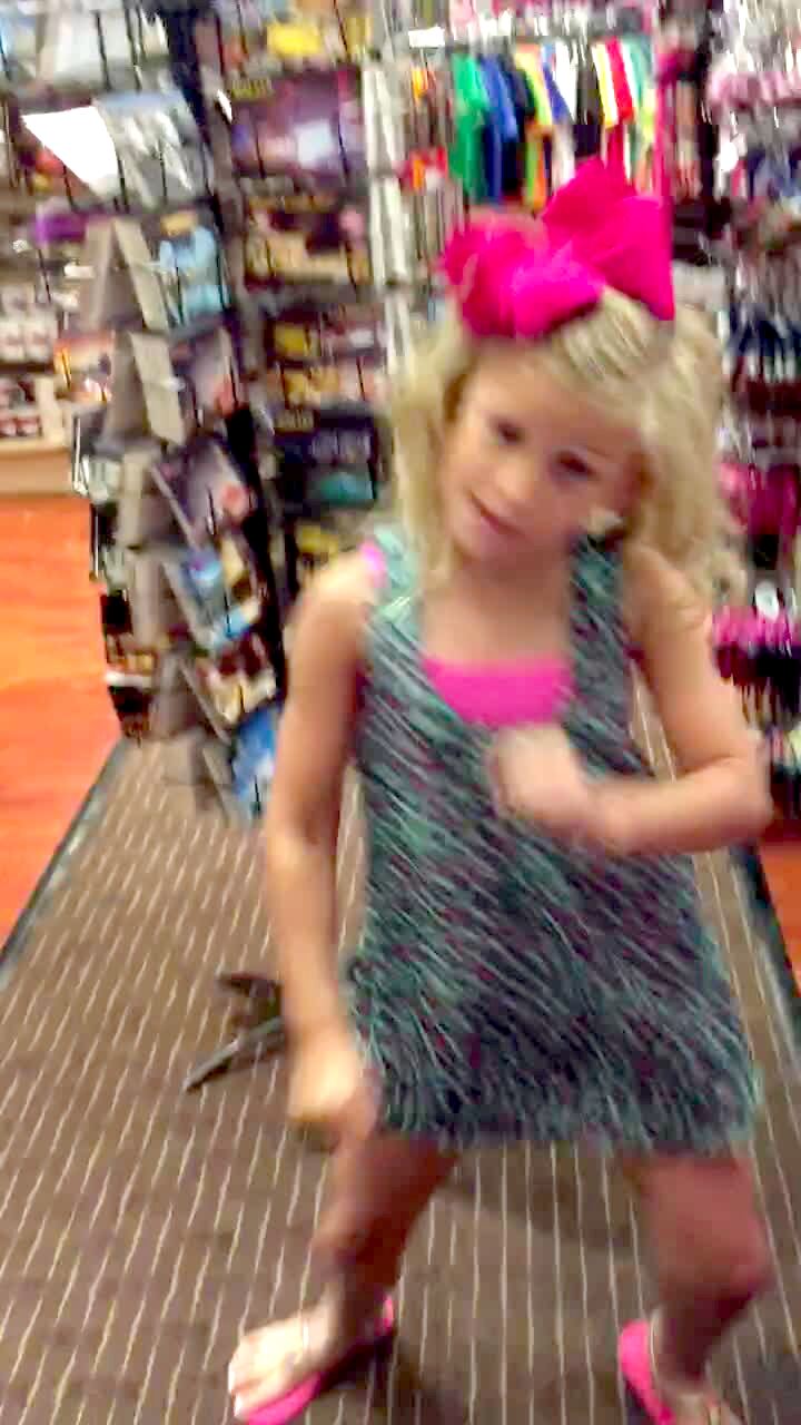 A tot girl throws her tot brother into a postcard stand for blocking her dancing into camera indoors.