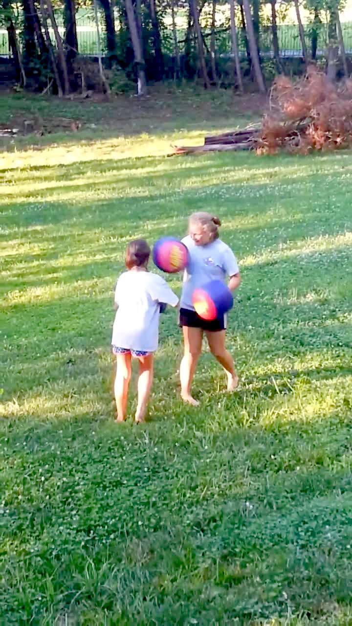 Two young girls box with inflatable round gloves on and the younger girl charges and screams and the older girl holds her fists out and she runs into them and falls in the backyard.