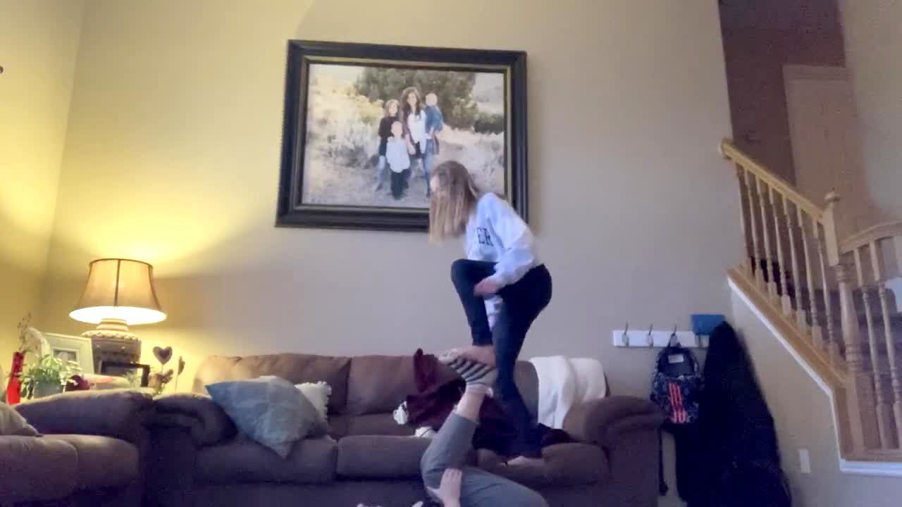 A young girl lays on her back with her feet in the air and another young girl stands on the couch above her and tries to balance on her feet and she falls in the living-room.