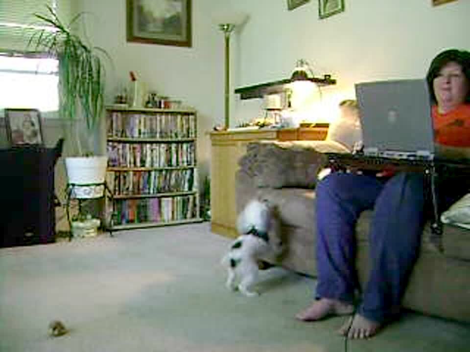 White & black spotted poodle tries to get up on the couch but can't reach. He whimpers and bounces rapidly. Finally jumps up. Dog