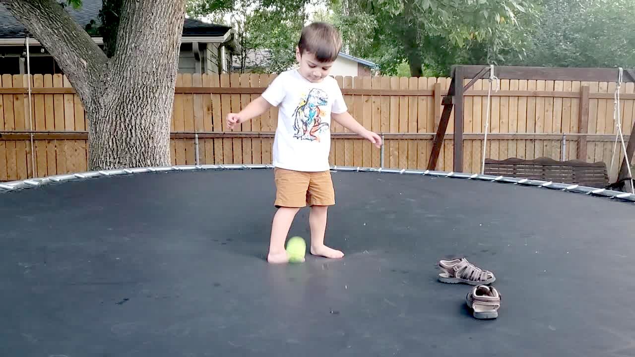 A tot boy laughs at a tennis ball that bounces on a trampoline in the backyard, and his Boston Terrier dog jumps up at the ball from below him.
