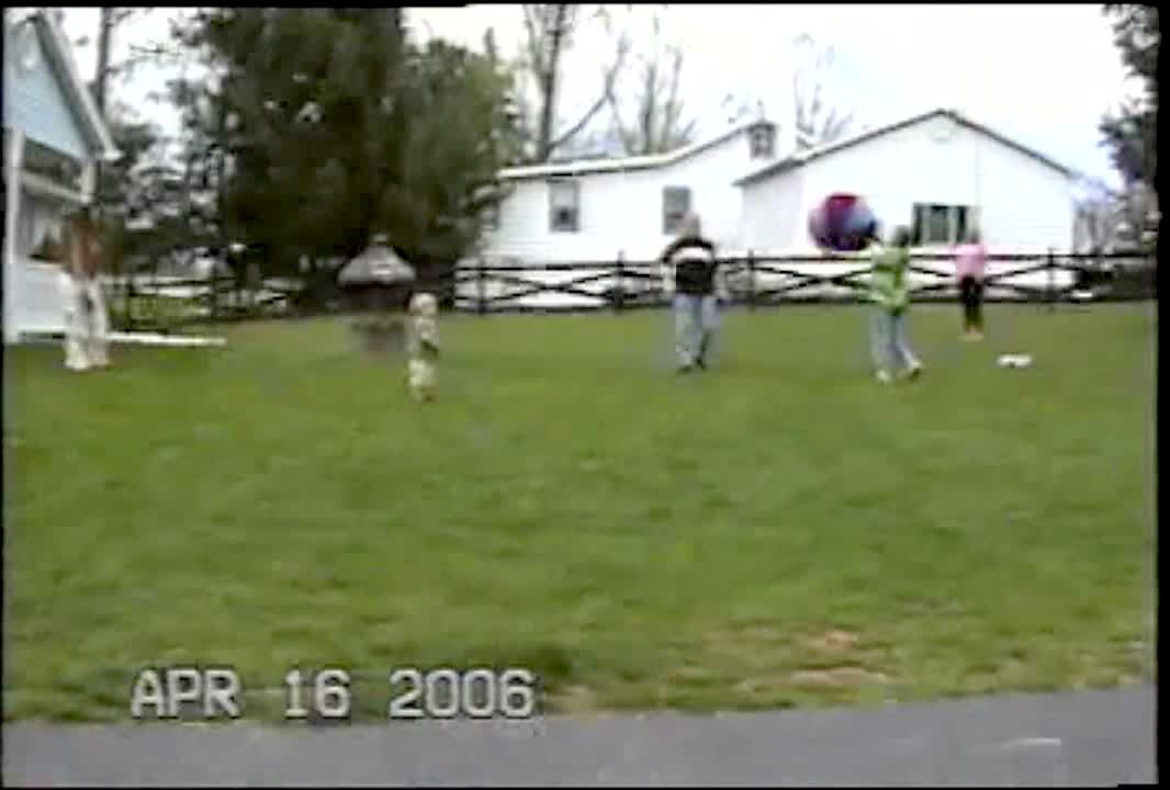 Family plays kickball, tot boy runs through the middle of the game and gets hit in the head by the ball. He falls down. No recovery, camera cuts off.