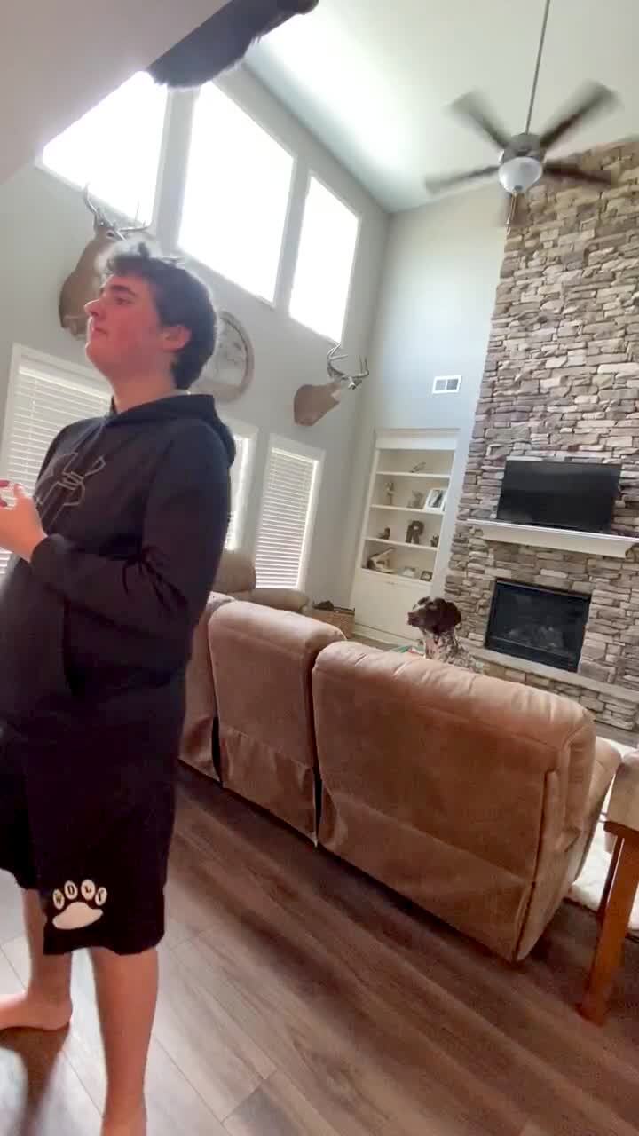A teen boy sways from side to side in a living room and a dog on a living room couch behind him moves from opposite side to opposite side to look around the boy.