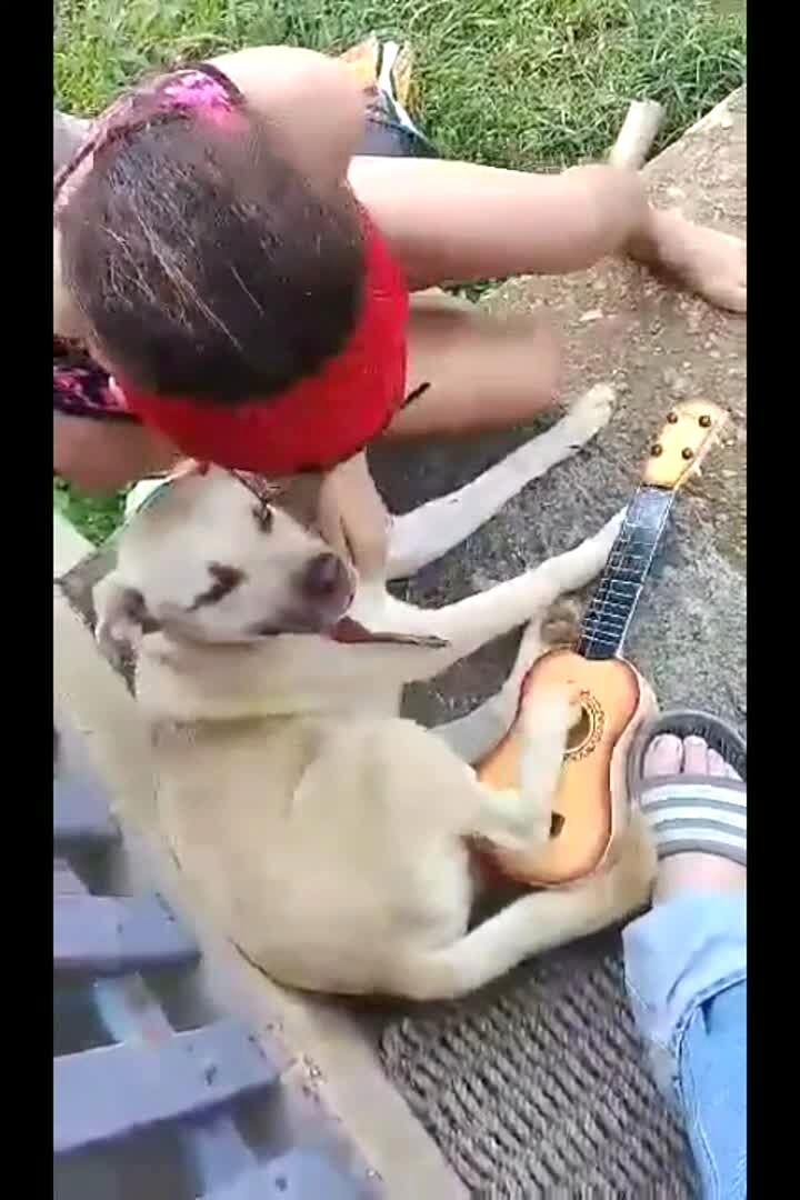 A young girl scratches a dog's belly and the dog shakes his back leg against a guitar and strums the strings in the backyard.