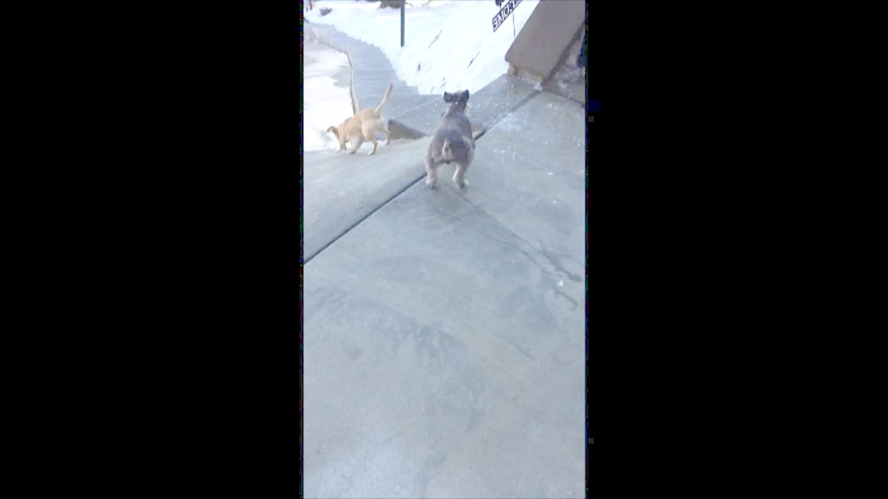 Bulldog slowly slides down the stairs on his stomach. Man walks behind him. Dog