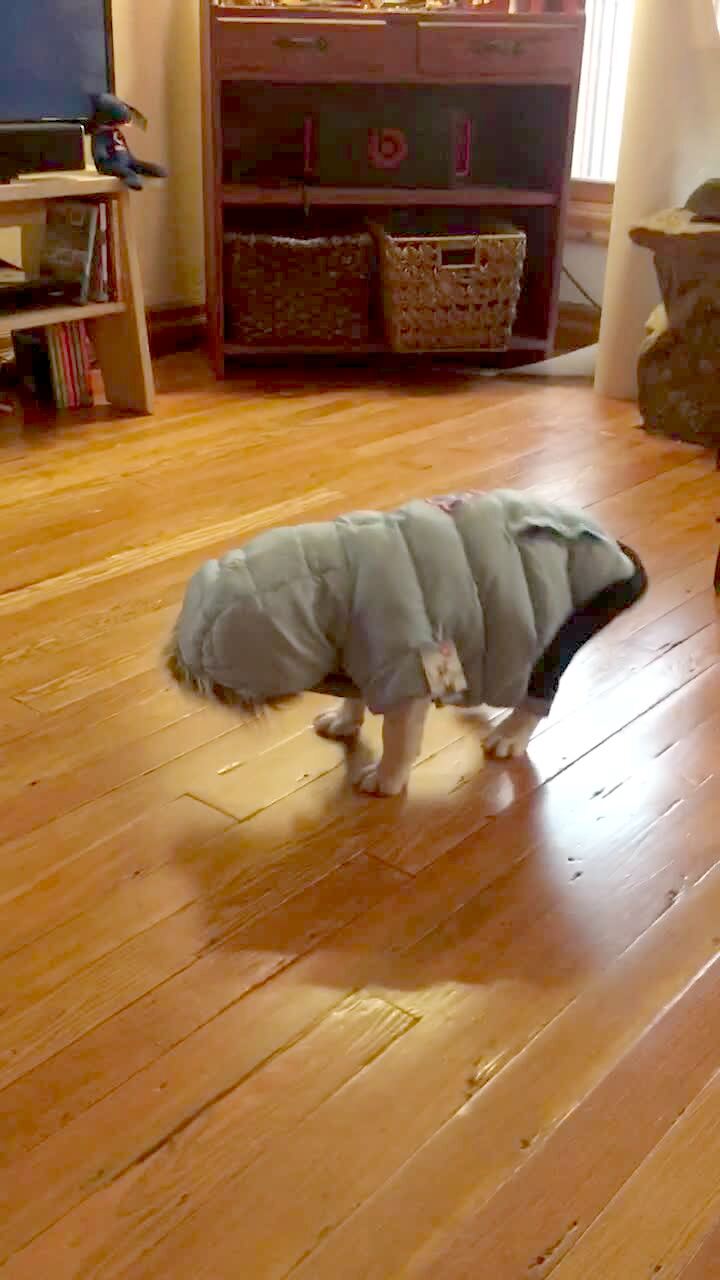 An English Bulldog puppy dog attempts to walk in a winter coat, but falls over.