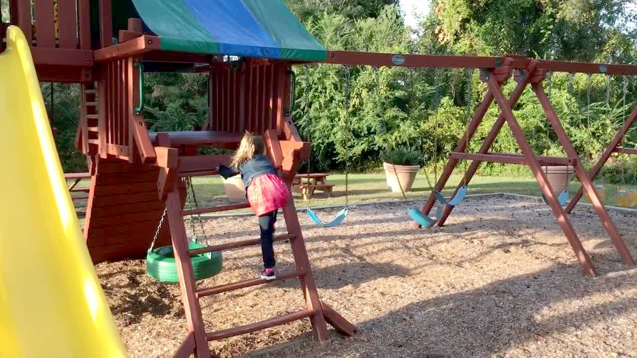 A bulldog dog follows a young girl up a ladder and down a slide.