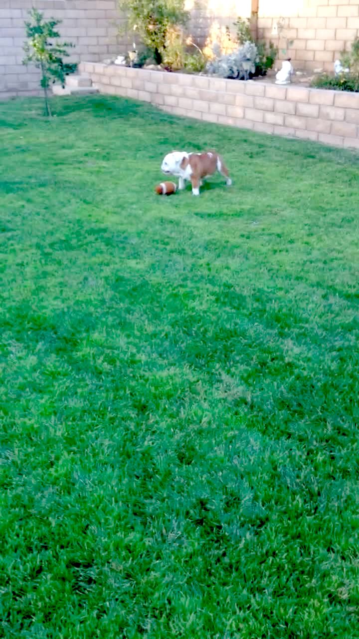An English bulldog dog runs after a football outdoors and stops short, causing him to somersault on his head over the ball before he picks it up and brings it to his owner.