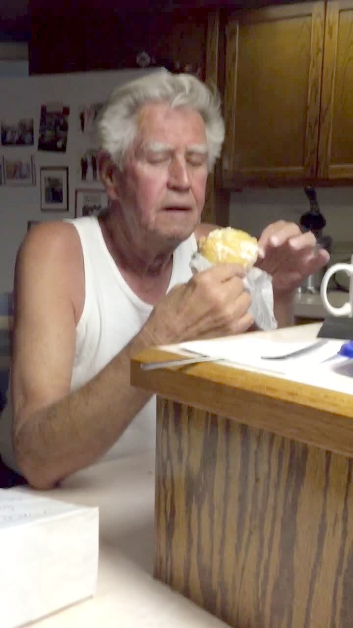 A senior man eats a snack in the kitchen. His adult son asks how the food is, and the man says "not very good." His wife then tells him that he just ate a dog treat by mistake.