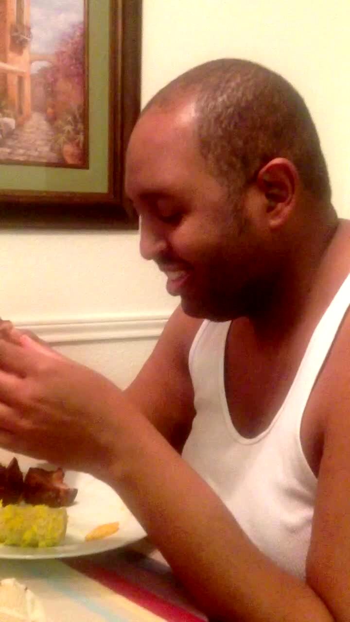 A senior man struggles to cut his birthday cake in the kitchen because the cake is too rubbery and under-cooked. At 1:35, the man finds out that the cake is styrofoam and laughs really hard for a while. Everyone else stops, but he continues to laugh a little longer.