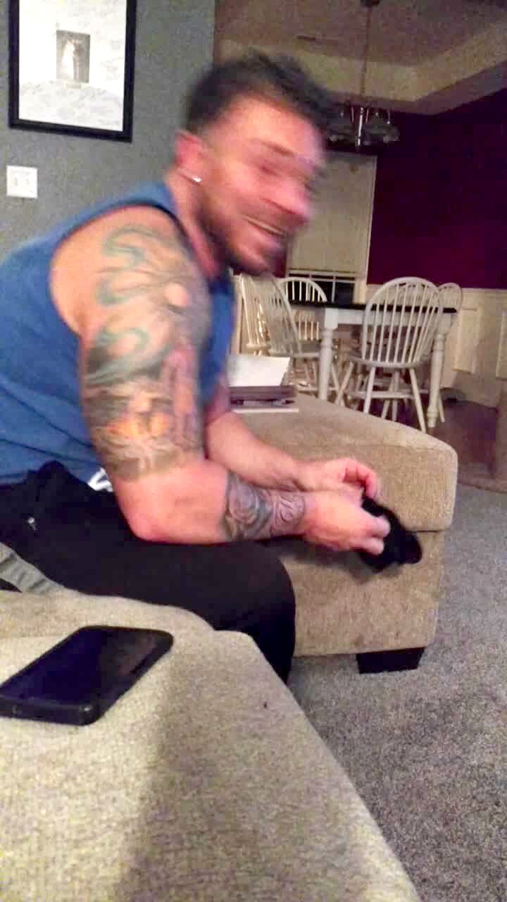 A man shows off the breakfast he made for his wife and dumps it on the floor. Kitchen
