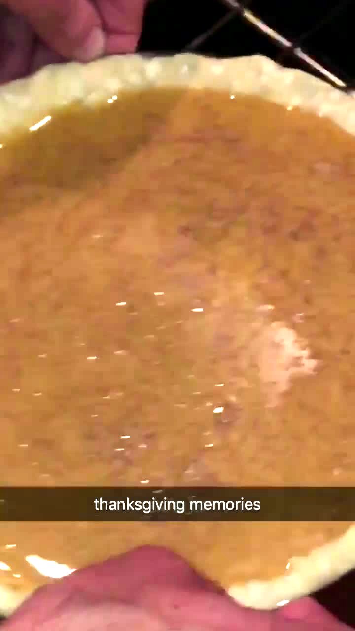 A man lowers a pie into an oven in the kitchen while a woman tells him not to spill any of the contents. He places it on the rack too hard and spills the contents of the pie as well as the pie already on the rack. Snapchat