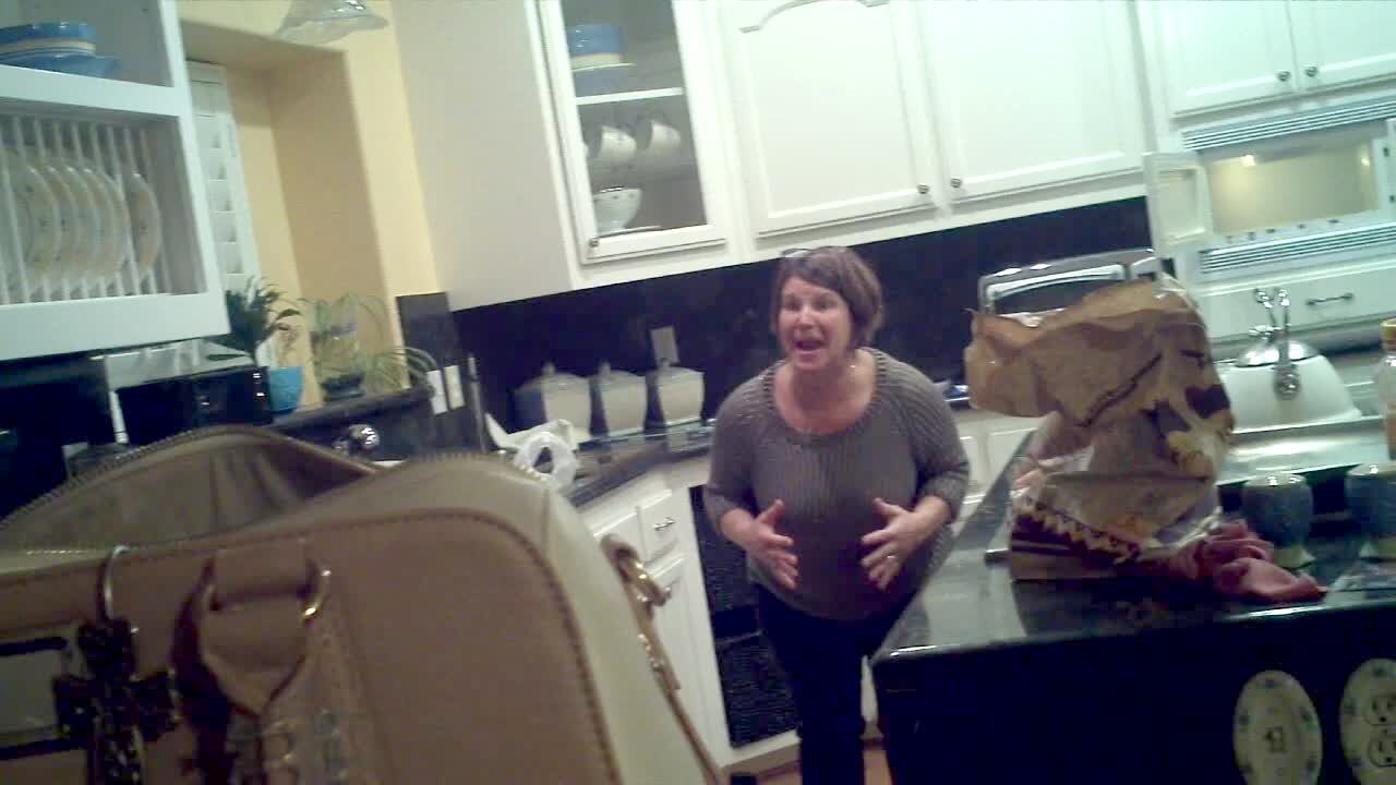 A man tries to open a brine bag for a turkey, and the bag breaks then spills all over the kitchen floor. A woman sees the mess and says "I don't even know what to do right now." Security footage.
