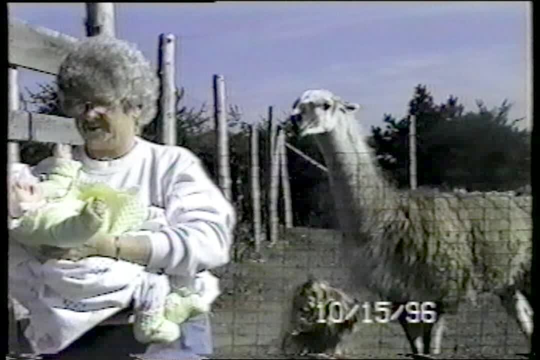"Llama Spits On Grandma" Llama spits on grandma holding baby . Senior
