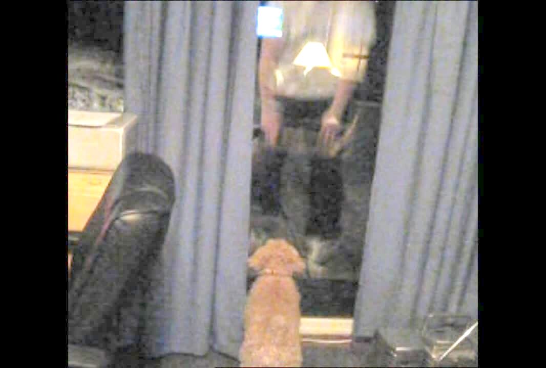 Man jumps outside and gets dog to jump in through the glass door. Dark video, at night.